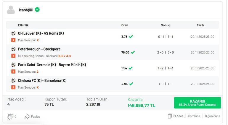 4 maçta 2.267 oran yakaladı, 75 TL’ye 146.698 TL kazandı!