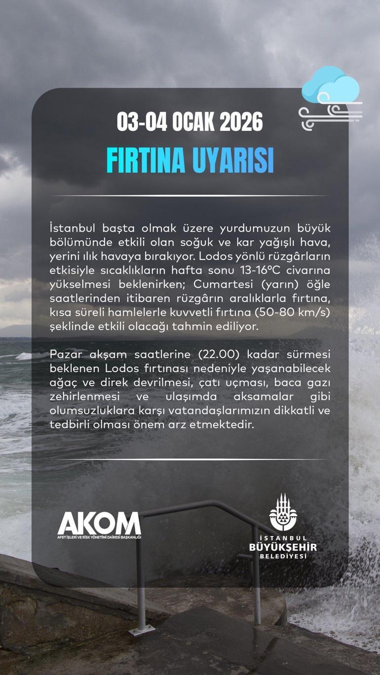 İstanbul’da hava bir kez daha ters köşe yapıyor. Kar ve soğuk sonrası hızla yükselen sıcaklıklarla birlikte bu kez lodos fırtınası kapıda. AKOM’dan yapılan açıklamada, yarın öğle saatlerinden itibaren etkisini artırması beklenen fırtınanın, çatı uçması, ağaç ve direk devrilmesi ile baca gazı zehirlenmesi risklerini beraberinde getireceği belirtilerek vatandaşlara kritik saatler için uyarı yapıldı.