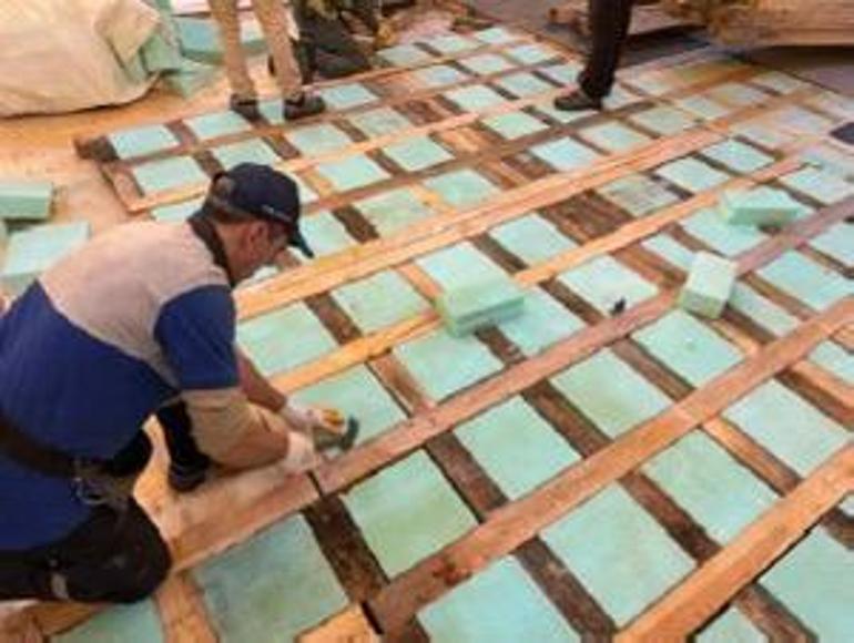 Ardından iş makinelerinin hareket edeceği alanda yükün yayılmasını ve mermerlerin zarar görmemesini sağlayan çok katmanlı geçici döşeme sistemi kuruldu: buhar geçişine izin veren örtü, keçe, kum, 18 mm kontra, 10×10 cm ahşap karkas, karkaslar arasına xps levha, karkasların üzerine ses önleyen şilte ve en üst katmana baklava sac uygulanarak zemin tamamen korumaya alındı.