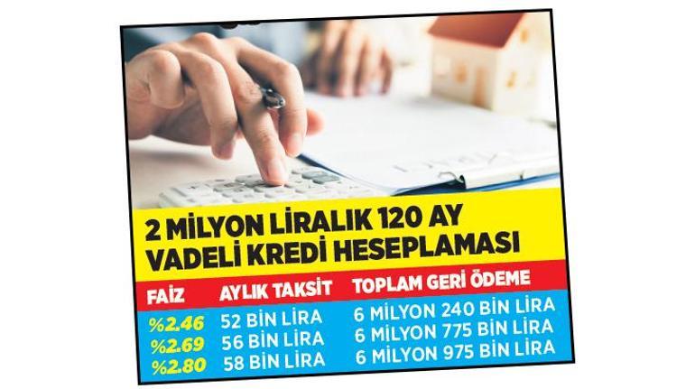 Bu kapsamda kamu ve bazı özel bankalarda uygulanan konut kredisi faiz oranlarında bankalara göre en düşük oranlar yüzde 2.46, yüzde 2.49, yüzde 2.50, yüzde 2.54, yüzde 2.55, yüzde 2.69 olarak oluştu. Bu hesapla önceki ay ortalama yüzde 2.80 ile çekilen 2 milyon liralık bir kredinin aylık taksidi 58 bin lira seviyesinde bulunurken, yüzde 2.46 ile çekilen aynı kredi için ise 52 bin lira taksit ödeniyor.