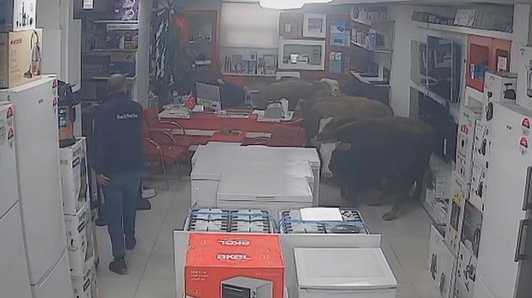 İş yerinde bir süre gezinen inekler, beyaz eşyalara da zarar verdi. O anlar, iş yerinin güvenlik kameralarınca kaydedildi.
