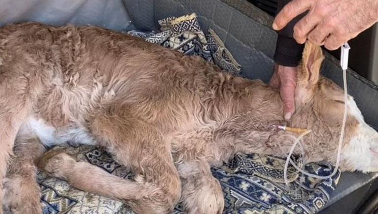 Buzağıya aracın bagajında ilk müdahaleyi yapan veteriner hekim İhsan Şahin, hayvanın ishale bağlı su kaybı nedeniyle güçsüz düştüğünü belirleyip serum taktı.