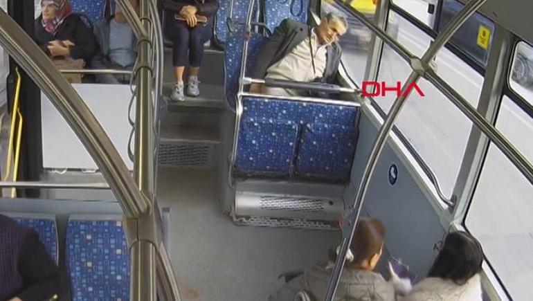 O anlar, belediye otobüsünün araç içi kamerasına da yansıdı. Görüntülerde; arka koltukta cam kenarında oturan erkek yolcunun fenalaştığı, bir süre sonra başının yana doğru düşüp, bayıldığı ve ağzından köpük geldiği görüldü.