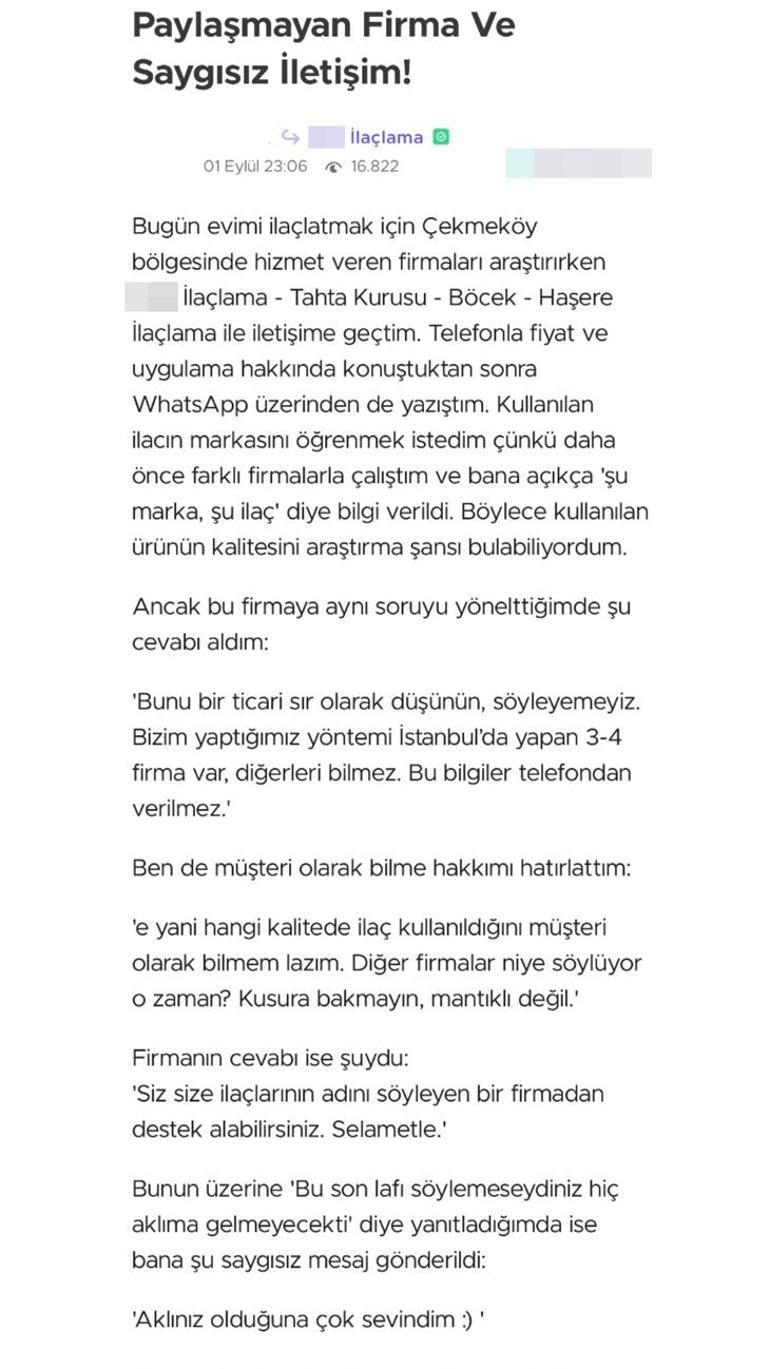 Bir kullanıcı yorumunda, “Bugün evimi ilaçlatmak için Çekmeköy bölgesinde hizmet veren firmaları araştırırken İlaçlama – Tahta Kurusu – Böcek – Haşere İlaçlama ile iletişime geçtim. Telefonla fiyat ve uygulama hakkında konuştuktan sonra WhatsApp üzerinden de yazıştım. Kullanılan ilacın markasını öğrenmek istedim çünkü daha önce farklı firmalarla çalıştım ve bana açıkça ‘şu marka, şu ilaç’ diye bilgi verildi. Böylece kullanılan ürünün kalitesini araştırma şansı bulabiliyordum. Ancak bu firmaya aynı soruyu yönelttiğimde şu cevabı aldım ‘Bunu bir ticari sır olarak düşünün, söyleyemeyiz. Bizim yaptığımız yöntemi İstanbul’da yapan 3-4 firma var, diğerleri bilmez. Bu bilgiler telefondan verilmez.’ Ben de müşteri olarak bilme hakkımı hatırlattım ‘yani hangi kalitede ilaç kullanıldığını müşteri olarak bilmem lazım. Diğer firmalar niye söylüyor o zaman? Kusura bakmayın, mantıklı değil.’ Firmanın cevabı ise şuydu; ‘Siz size ilaçlarının adını söyleyen bir firmadan destek alabilirsiniz. Selametle.’ Bunun üzerine ‘Bu son lafı söylemeseydiniz hiç aklıma gelmeyecekti’ diye yanıtladığımda ise bana şu saygısız mesaj gönderildi: ‘Aklınız olduğuna çok sevindim.’