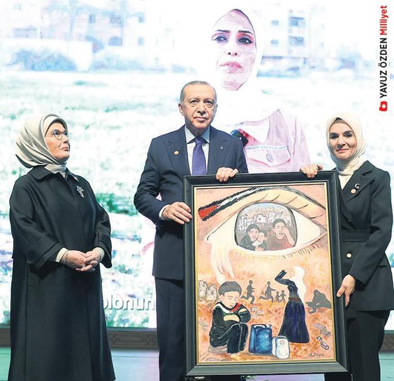 Cumhurbaşkanı Erdoğan’a programın sonunda Filistinli kadın ressam Yasemin Esad Muhaysin’in yağlı boya tablosunun replikası takdim edildi. Gazze Şeridi’nin orta kesimindeki Deyr el-Belah kampında yerinden edilmiş Filistinli ressam Yasemin Esad Ebu Muhaysin tarafından hazırlanan “Hayatta Kalanların Gözyaşları” isimli tablonun orjinali, halen abluka altında bulunan Gazze’den tüm girişimlere rağmen çıkarılamayınca, yağlı boya dokulu replikası hazırlatıldı.
