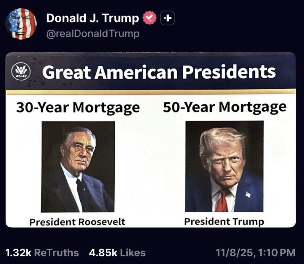Trump ise Truth Social’ın bu girişimi Franklin D. Roosevelt’in Yeni Düzen dönemindeki 30 yıllık ipotek standardına benzettiği mesajını paylaştı.