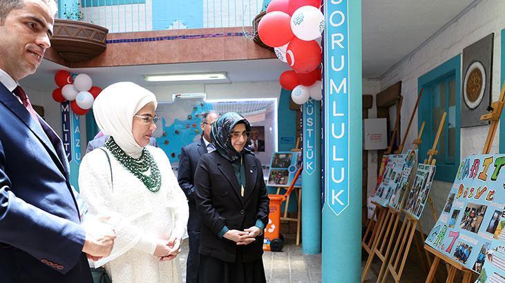 “Geri Dönüşüm ve Çevre” temalı sergiyi gezen Emine Erdoğan, buradaki çalışmalar hakkında öğrenci ve öğretmenlerden bilgi aldı.