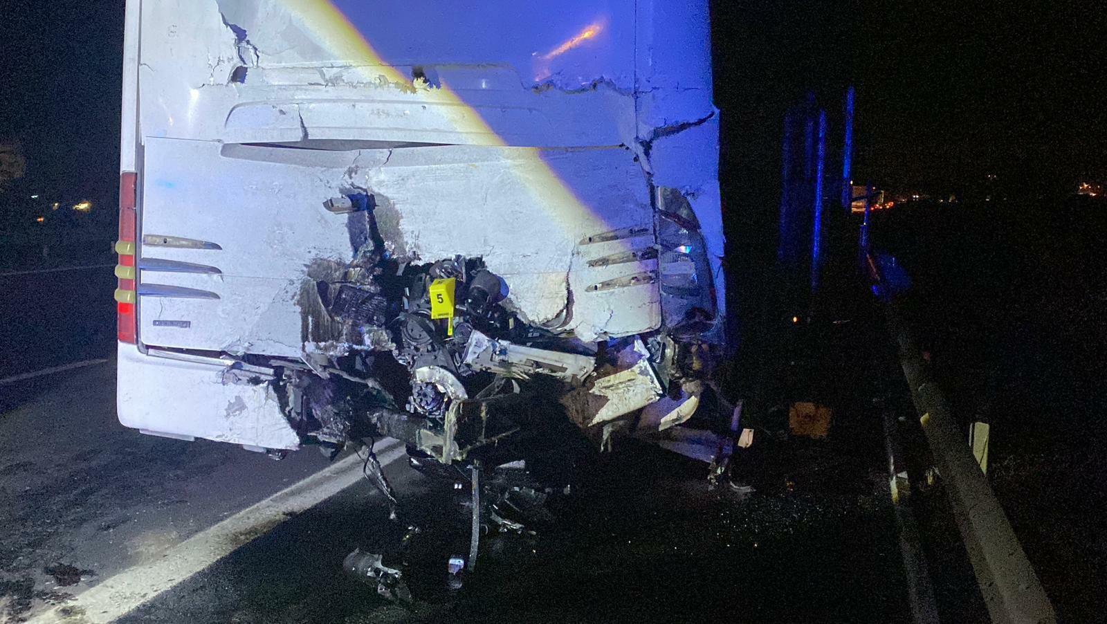 Emniyet şeridinde korkunç kaza! TIR, park halindeki otobüse çarptı: 14 yaralı