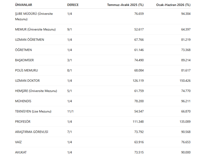 Bu artışlar neticesinde Ocak 2026 itibarıyla bazı kamu görevlilerinin net görev aylığı şöyle belirlendi: