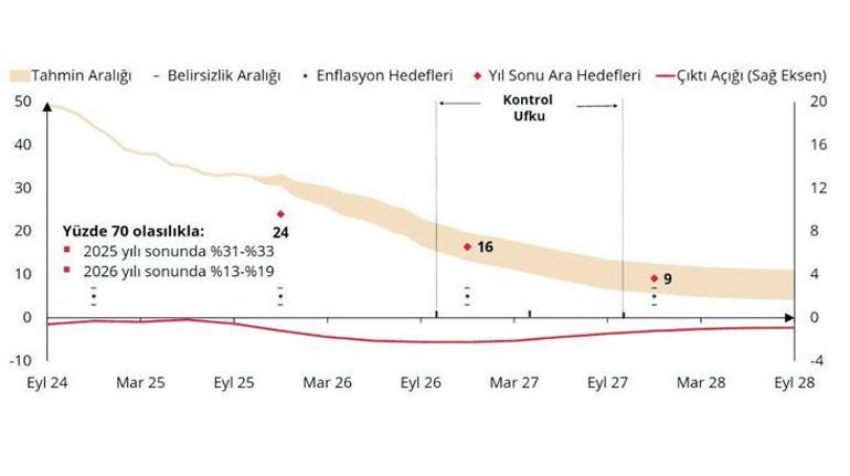 Para politikasındaki sıkı duruşu fiyat istikrarı sağlanana kadar kararlılıkla sürdüreceklerini belirten TCMB Başkanı Karahan yaptığı sunumda 2025 sonu enflasyonun yüzde 31 – 33 aralığında olacağı tahminini paylaştı. Bir önceki sunumda tahmin yüzde 25 – 29 aralığındaydı.