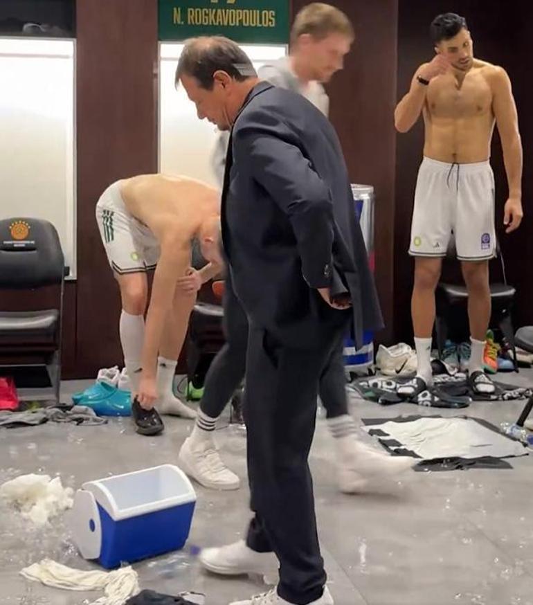 Panathinaikos oyuncuları Rogavopoulos’un tarihi başarısını kutlarken soyunma odasının zemini ıslandı.