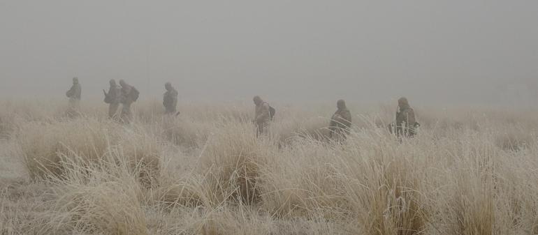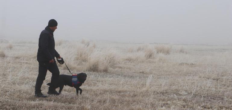 Jandarma iz takip köpeği Tapan’ın da kullanıldığı arama çalışmaları yoğun sis altında devam ediyor. (DHA)