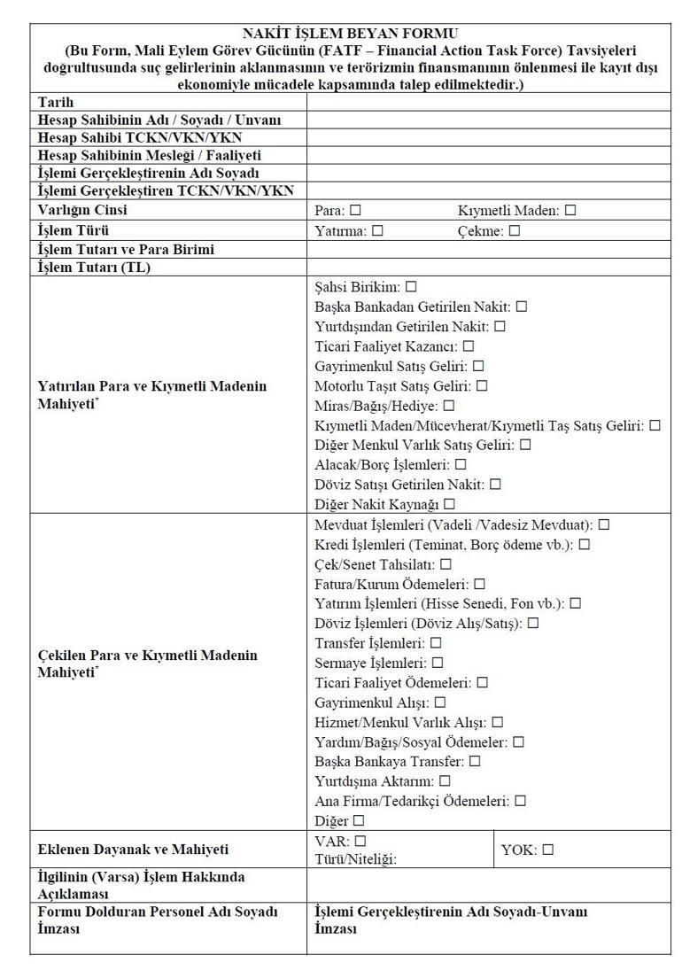 Öte yandan bankadan nakit çekimlerinde de paranın nerede kullanılacağının beyan edileceği belirtildi. Banka paranın kaynağını soracak ve gerekli belgele ve açıklamaları MASAK’a iletecek.