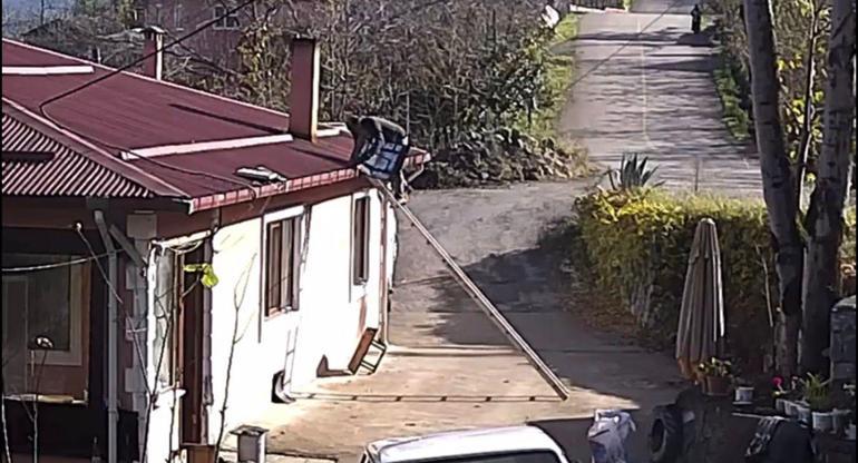 Ordu’da mahalle muhtarı Atıf Güngör (58), evinin baca şapkasını değiştirmek için çıktığı çatıda merdivenin kaymasıyla yere düşerek sol dirseğini kırdı. O anlar, çevredeki bir evin güvenlik kamerasına saniye saniye yansıdı.