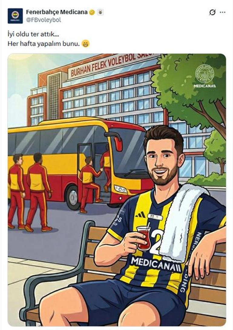 Sarı-lacivertli kulüp galibiyet sonrasında sosyal medya hesabından göndermeli bir paylaşımda bulundu. Otobüse binen sarı-kırmızılı voleybolculara Fenerbahçeli Adis Lagumdzija’ın “İyi oldu ter attık… Her hafta yapalım bunu.” sözleriyle seslenmesi resim olarak canlandırıldı.