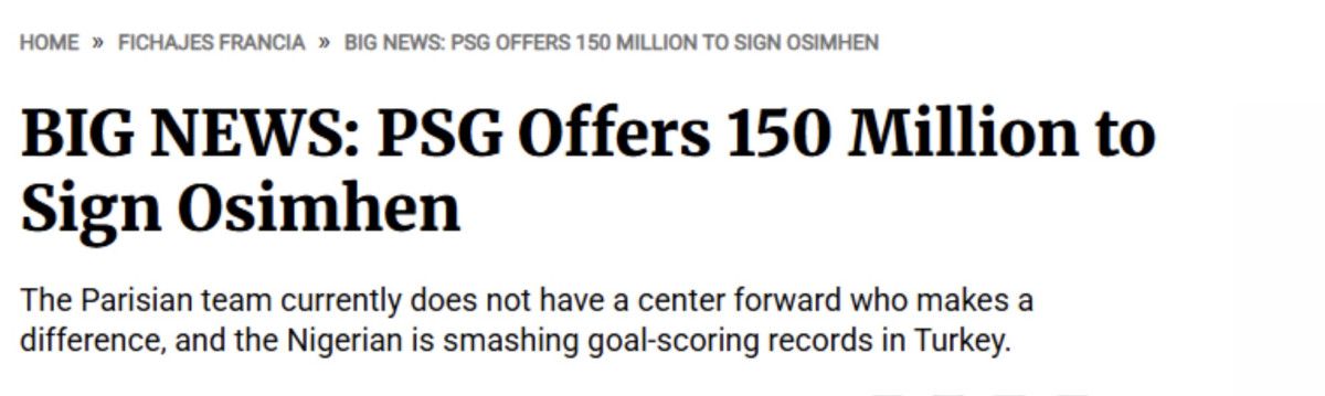 Fichajes, Fransa’nın ünlü kulübü PSG’nin Osimhen için yaklaşık 150 milyon euroluk bir teklif yapmaya hazırlandığını duyurdu.