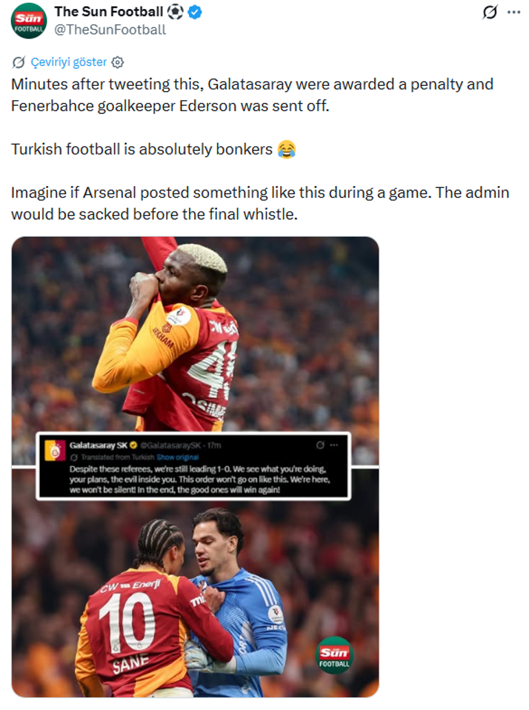 Galatasaray’ın devre arasında yaptığı paylaşımı öne çıkaran İngiliz basınından The Sun’da şu ifadeler kullanıldı: Devre arası tweeti attıktan dakikalar sonra, Galatasaray’a penaltı verildi ve Fenerbahçe kalecisi Ederson oyundan atıldı. Türk futbolu tam bir çıldırmışlık, Arsenal bir maç sırasında böyle bir şey paylaşsaydı, admin final düdüğünden önce kovulurdu.