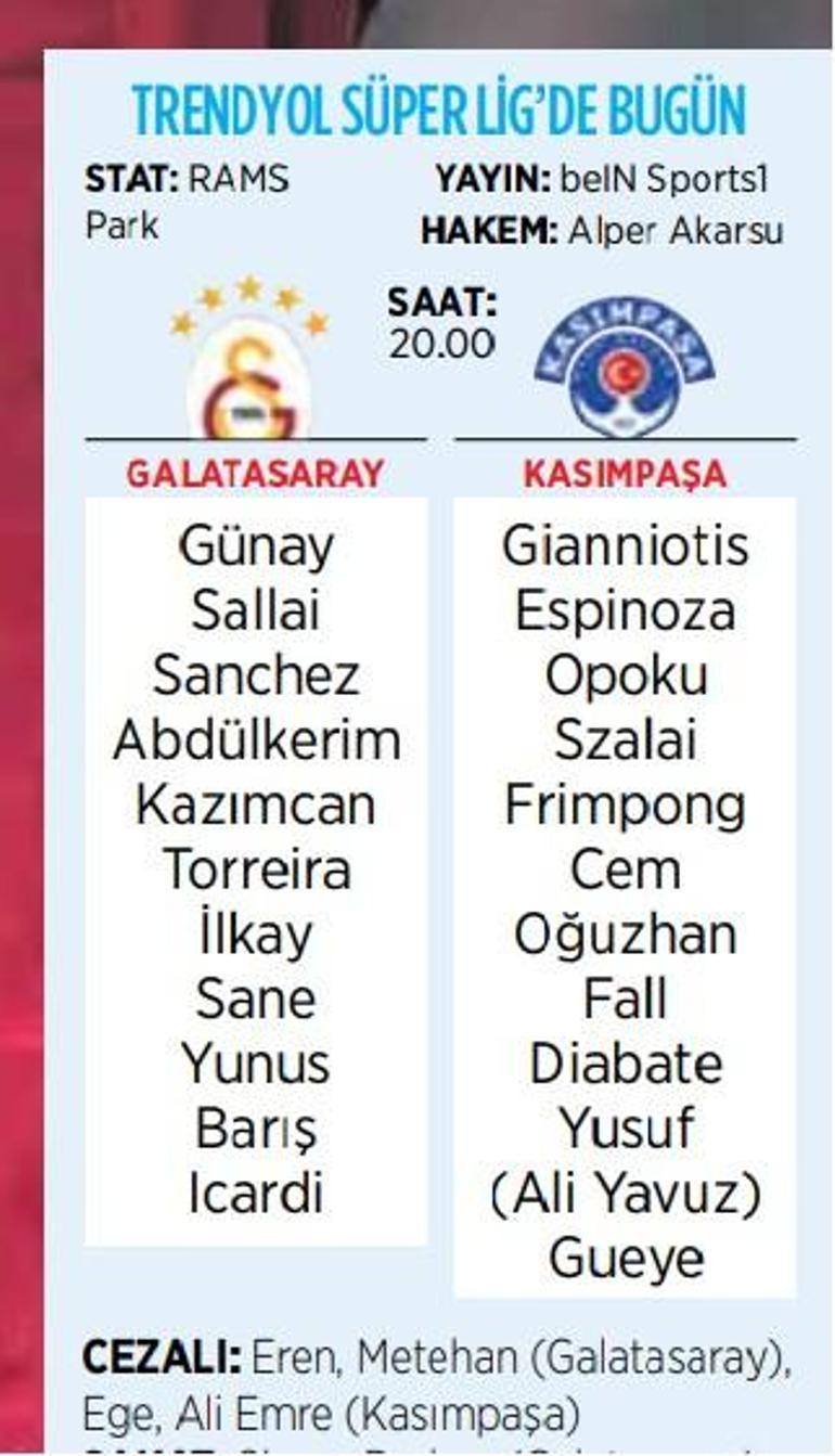 Cim-Bom’da sakatlıkları devam eden Singo ve Berkan ile bahis soruşturması kapsamında ceza verilen Eren Elmalı ile tutuklanan Metehan Baltacı da bugün oynayamayacak. Ayrıca Afrika Uluslar Kupası’na giden Osimhen, Lemina ve Jakobs da yer alamayacak. Osimhen ayrıca sarı kart cezasını da bu karşılaşmada çekecek. Kasımpaşa’da ise tedavileri süren Hajradinovic, Cafu ve Baldursson forma giyemeyecek. Tunus Milli Takımı’nda bulunan Ben Ouanes ile Arous da Afrika Kupası’na gitti. İki genç kaleci Ege ve Ali Emre de bahis nedeniyle cezalı bulunuyor.