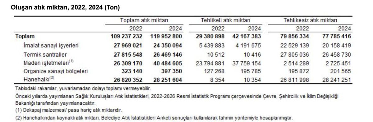 Araştırma kapsamındaki imalat sanayi işyerleri, maden işletmeleri, termik santraller, organize sanayi bölgeleri (OSB) ve hanehalklarında 2024 yılında 42,2 milyon tonu tehlikeli olmak üzere toplam 120 milyon ton atık oluştu.