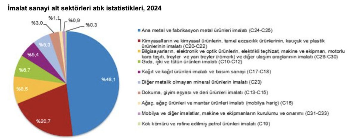 İmalat sanayi iş yerlerinde 4,2 milyon tonu tehlikeli olmak üzere toplam 24,4 milyon ton atık oluştu. Toplam atığın yüzde 70,1’i satıldı veya lisanslı atık işleme tesislerine gönderildi, yüzde 12,1’i tesis bünyesinde geri kazanıldı veya dolgu malzemesi olarak kullanıldı veya doğaya yeniden kazandırıldı, yüzde 10,8’i düzenli depolama tesislerine gönderildi, yüzde 2,6’sı beraber yakma (ko-insinerasyon) veya yakma tesislerine gönderildi, yüzde 2,4’ü belediye veya OSB yönetimleri tarafından toplandı, yüzde 1,8’i iş yeri sahasında depolandı, yüzde 0,1 ise diğer yöntemlerle bertaraf edildi.