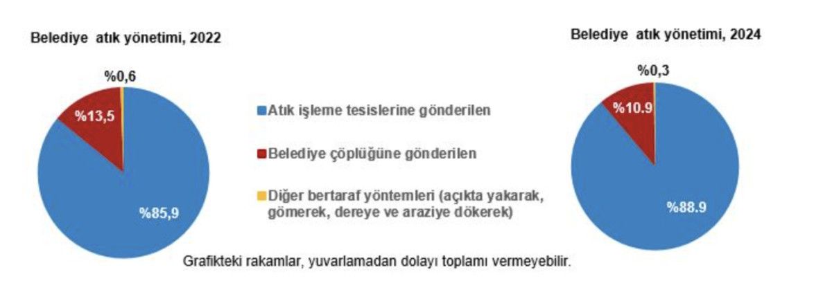 Toplam 1 401 belediyenin 1 392’sinde atık hizmeti verildiği tespit edildi. Atık hizmeti verilen belediyelerde toplanan 32,3 milyon ton atığın yüzde 88,9’u atık işleme tesislerine ve yüzde 10,9’u belediye çöplüklerine gönderilirken, yüzde 0,3’ü ise diğer yöntemlerle bertaraf edildi. Belediyelerde toplanan kişi başı günlük ortalama atık miktarı 1,09 kg olarak hesaplandı.