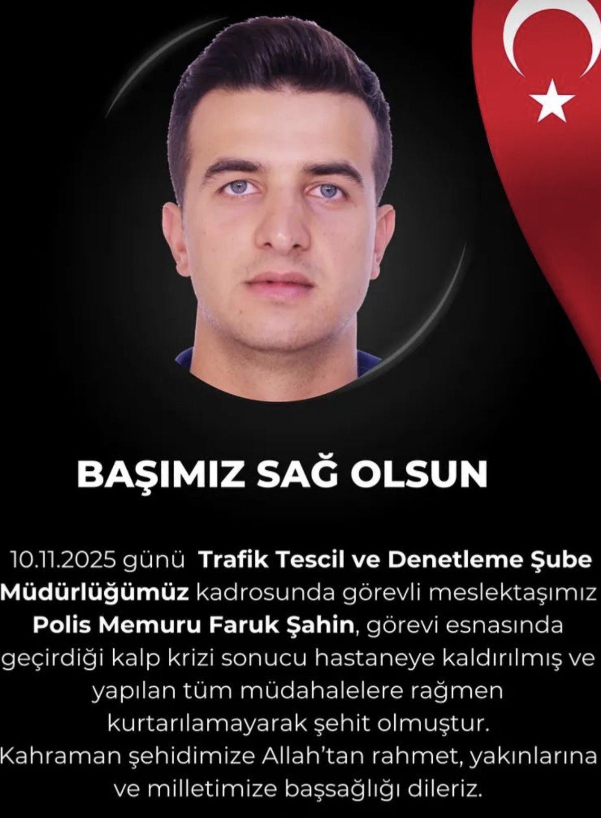 Osmaniye İl Emniyet Müdürlüğü tarafından paylaşılan başsağlığı mesajında, “10 Kasım günü Trafik Tescil ve Denetleme Şube Müdürlüğümüz kadrosunda görevli meslektaşımız polis memuru Faruk Şahin, görevi esnasında geçirdiği kalp krizi sonucu hastaneye kaldırılmış ve yapılan tüm müdahalelere rağmen kurtarılamayarak şehit olmuştur. Kahraman şehidimize Allah’tan rahmet, yakınlarına ve milletimize başsağlığı dileriz.” denildi.