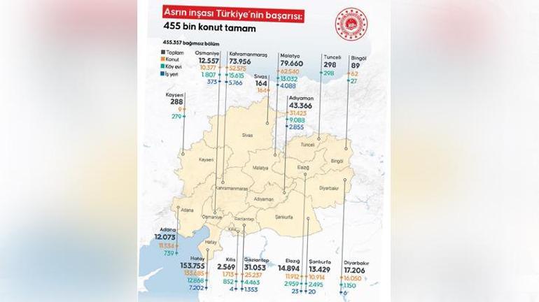 Cumhurbaşkanı Erdoğan, törende Hatay’daki 55 bin 681 bağımsız bölüm ile Kahramanmaraş’ta 22 bin 81, Malatya’da 11 bin 367, Adıyaman’da 4 bin 833, Osmaniye’de 3 bin 357, Elazığ’da 2 bin 568, Gaziantep’te 1620, Şanlıurfa’da 1333, Diyarbakır’da 887, Adana’da 692, Kilis’te 308, Kayseri’de 224, Tunceli’de 201, Bingöl’de 27 olmak üzere 105 bin 179 konut, köy evi ve iş yerini daha depremzedelere teslim edeceklerini söyledi. “Böylece sözümüzün arkasında durarak 11 ilimizde 455 bin 357 bağımsız bölümü hak sahibi kardeşlerimizin istifadesine sunuyoruz” diyen Cumhurbaşkanı Erdoğan, konutların hayırlı uğurlu olmasını diledi.