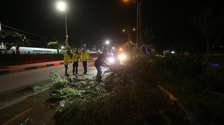 Belediye personeli devrilen ağaç ve uçan çatıları kaldırmak için çalışma başlatırken, polis ekipleri kent genelinde güvenlik önlemi aldı.