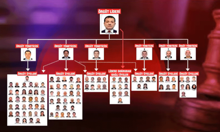 Örgütün şemasının çizildiği iddianamede, “örgüt elebaşı” konumunda şüpheli Ekrem İmamoğlu yer aldı. Şüpheliler Murat Ongun, Fatih Keleş, Ertan Yılmaz, Murat Gülibrahimoğlu, Adem Soytekin ve Hüseyin Gün de “örgüt yöneticisi” olarak şemada gösterildi. Şemada Ekrem İmamoğlu’na doğrudan bağlı 10 örgüt üyesinin olduğu, 77 örgüt üyesinin Fatih Keleş’e, 35’inin Murat Ongun’a, 8’inin Ertan Yılmaz’a, 7’sinin Hüseyin Gün’e, 6’sının Murat Gülibrahimoğlu’na ve 6’sının Adem Soytekin’e bağlı olduğu gösterildi.