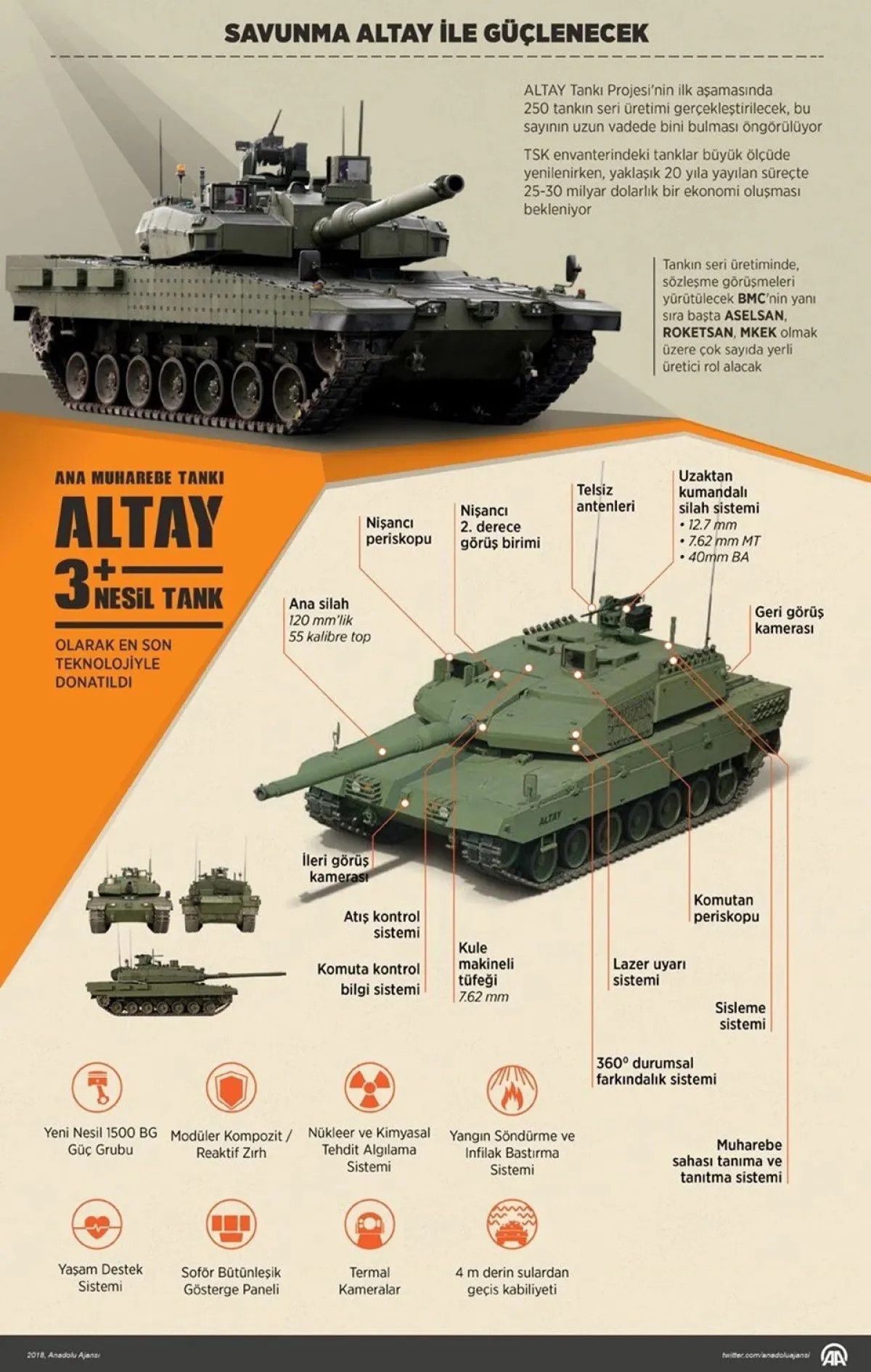 Habere göre Altay; aktif koruma sistemi, NATO uyumlu 120 mm topu, bin 500 beygir gücünde dizel motoru, gelişmiş sensörleri ve panoramik gözlem sistemleriyle komutana tam kontrol yetkisi veriyor.