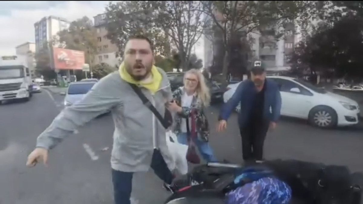 Ataşehir ilçesinde yolun karşısına geçmeye çalışan kadın ve oğulları, kendilerine tepki gösteren motosikletliye saldırdı. Ailenin, motosikletliye tekme tokatlı saldırı anları kask kamerasına saniye saniye yansıdı.