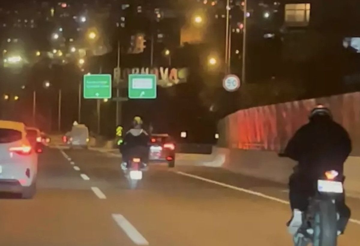 Tehlikeli yolculuğu görenler, motosiklet sürücülerini cep telefonu kamerasıyla kayda aldı.