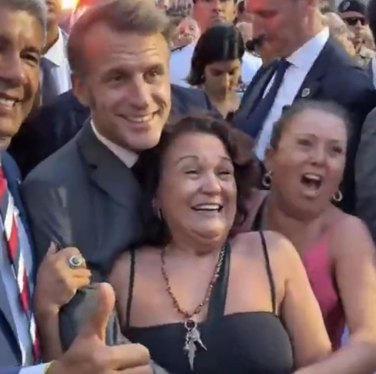 Macron’a sarılan bir kadın, uzun süre bırakmadı ve sevincini de bağırarak gösterdi.
