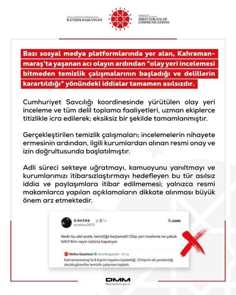 Dezenformasyonla Mücadele Merkezi, Kahramanmaraş’ta yaşanan okul saldırısının ardından sosyal medyada dolaşıma giren ‘olay yeri incelemesi tamamlanmadan temizlik yapıldığı ve delillerin karartıldığı’ yönündeki iddiaların gerçeği yansıtmadığını açıkladı.