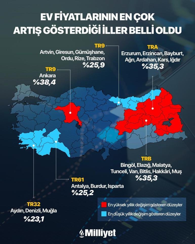 Buna göre İstanbul ve İzmir’de fiyatlar enflasyonun altında artarken, Ankara’da fiyatlarda reel bazlı yükseliş dikkat çekti. Ankara’nın ardından fiyatı en çok artan şehirler doğu illeri oldu. Bu bölgelerde fiyat artışları %35 seviyelerinde kaldı.