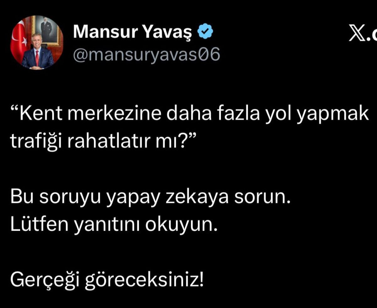 Ankara Büyükşehir Belediye Başkanı Mansur Yavaş, Cumhurbaşkanı Recep Tayyip Erdoğan’ın ulaşım politikalarına yönelik “Fetret devri yaşanıyor” eleştirilerine sosyal medyadan “Yapay zekaya sorun” diyerek yanıt verdi.