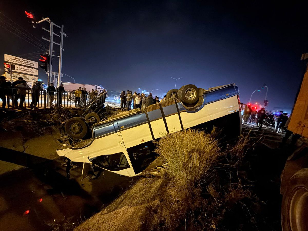 Çarpışmanın etkisiyle minibüs yol kenarındaki sulama kanalına devrildi.