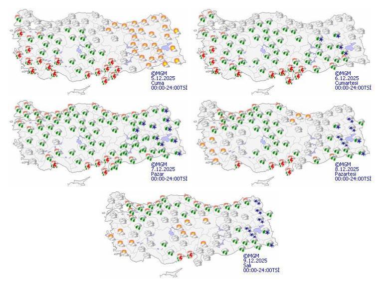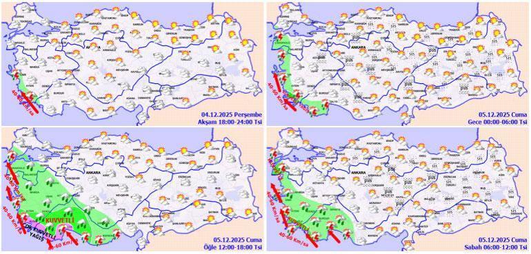 Meteoroloji Genel Müdürlüğü tarafından yapılan tahminlere göre: Ülkemizin iç ve batı kesimlerinin yer yer çok bulutlu, Ege, Marmara’nın güneybatısı ve Batı Akdeniz ile Doğu Akdeniz’in batı, İç Anadolu’nun güneybatı kesimlerinin sağanak, yer yer gök gürültülü sağanak yağışlı, diğer yerlerin parçalı ve az bulutlu geçeceği tahmin ediliyor. Yağışların, Ege’nin güneyi ve Batı Akdeniz’de yer yer kuvvetli, Muğla ve Antalya çevrelerinde ise çok kuvvetli olması bekleniyor. Bu gece ve sabah saatlerinde iç ve doğu kesimlerde pus, yer yer sis görüleceği tahmin ediliyor.