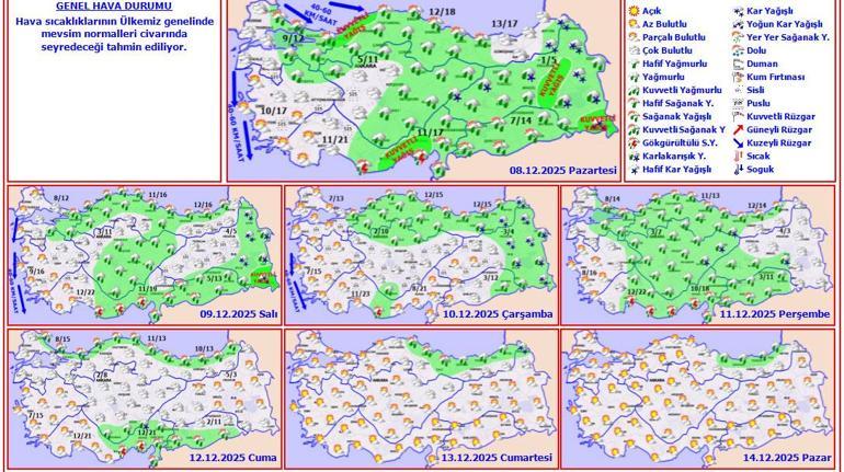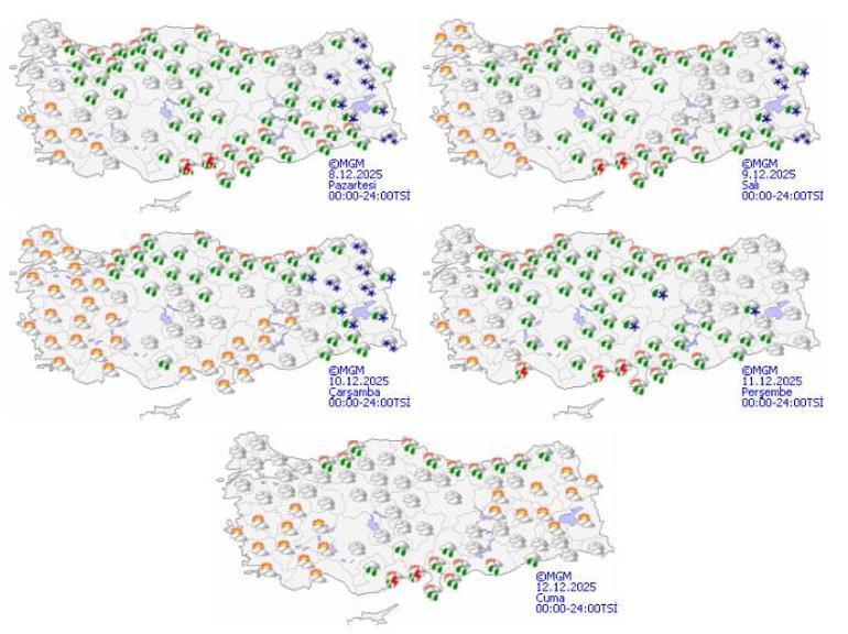Meteoroloji Genel Müdürlüğü tarafından yapılan tahminlere göre: Ülkemiz genelinin çok bulutlu, Güney Ege ile Çanakkale, İzmir, Zonguldak, Bolu ve Karabük çevreleri dışında kalan bütün bölgelerimizin aralıklı yağışlı geçeceği tahmin ediliyor. Genellikle yağmur ve sağanak, Akdeniz kıyılarında yer yer gök gürültülü sağanak, Doğu Karadeniz’in iç kesimlerinin yüksekleri ile Doğu Anadolu’nun kuzey ve doğusunda karla karışık yağmur ve yer yer kar şeklinde görülecek olan yağışların; Doğu Anadolu’nun güney ve batısı, Güneydoğu Anadolu’nun kuzeyi ile Kırklareli, İstanbul, Bursa, Balıkesir ve Yalova çevreleri, Antalya’nın doğu kıyıları, Erzurum’un güneyinde kuvvetli, Hakkari ve Şırnak çevrelerinde yer yer çok kuvvetli olması bekleniyor. Doğu Karadeniz’in iç kesimleri ile Doğu Anadolu’nun kuzey ve doğusunda buzlanma ve don olayı görüleceği tahmin ediliyor. Sabah ve gece saatlerinde İç Ege, İç Anadolu ve Batı Karadeniz’in iç kesimlerinde pus ve yer yer sis bekleniyor.