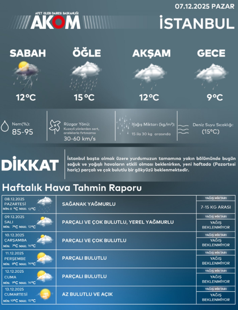 RÜZGAR: Genellikle güney yönlerden, hafif ara sıra orta kuvvette, Marmara’nın kuzey kesimlerinde kuzey ve kuzeybatı yönlerden kuvvetli olarak (40-60 km/saat) eseceği tahmin ediliyor.