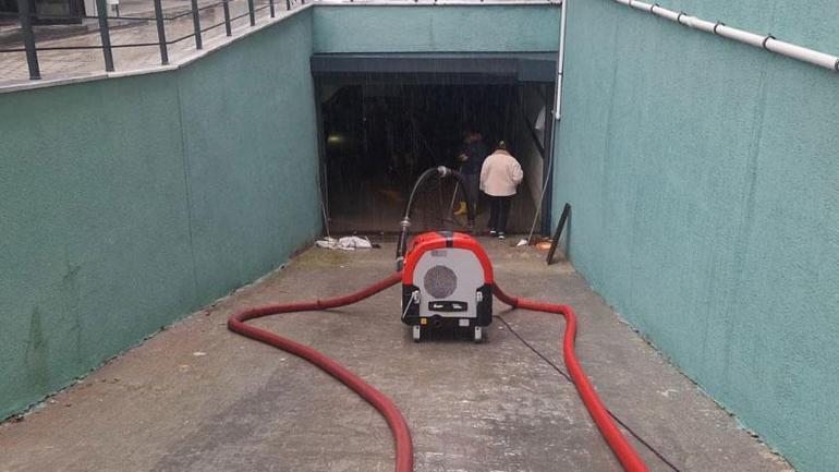 Sığınak bölümü ve asansör boşluğu da suyla dolan binanın elektrik trafosu da zarar gördü. Binanın elektriği kesilirken, ihbar üzerine bölgeye itfaiye ekibi sevk edildi. Otoparktaki suyu tahliye çalışmaları devam ediyor.
