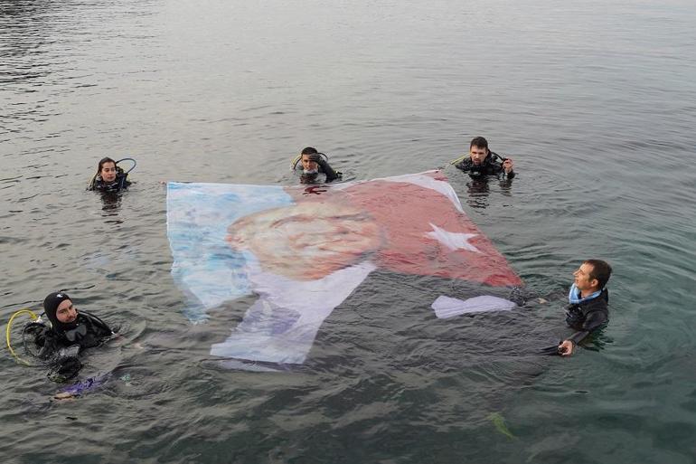 Dalgıçlar, su altında açtıkları Atatürk posterleri ve pankartlarla 09.05’te satha çıkarak yanan meşalelerle görsel bir anma gerçekleştirdi.