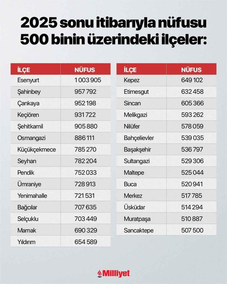 Türkiye İstatistik Kurumunun (TÜİK) açıkladığı adrese dayalı nüfus kayıt sistemi verilerine göre, İstanbul’un Esenyurt ilçesi 1 milyon 3 bin 95 kişilik nüfusuyla Türkiye’nin en kalabalık ilçesi oldu.