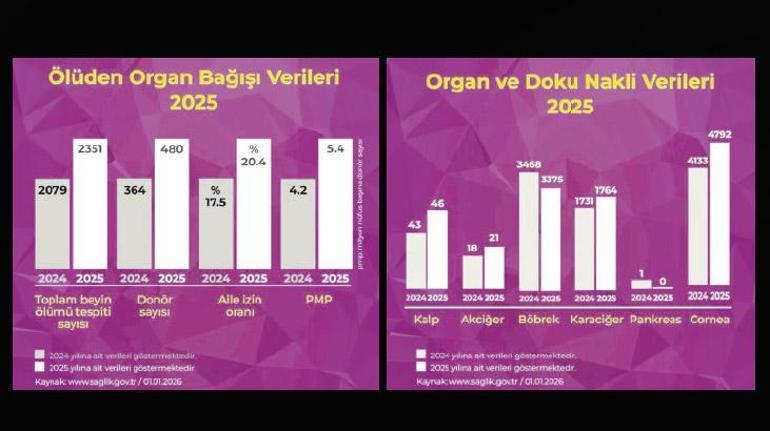 DİDEM SEYMEN / HABER MERKEZİ – Türkiye Organ Nakli Vakfı tarafından paylaşılan 2025 yılı verilerine göre, 2025’te 2 bin 351 beyin ölümü tespiti yapılmasına karşın, donör sayısı yalnızca 480’de kaldı. Aile izin oranı ise yüzde 20.4 olarak kayıtlara geçti. Başka bir ifadeyle, her 5 beyin ölümünden sadece 1’i organ bağışına dönüşebildi. Geçen yıla göre beyin ölümü tespit sayısı artmasına rağmen bağış oranındaki yükseliş sınırlı kaldı. Milyon nüfus başına düşen donör sayısı (PMP) 5.4’te kaldı. Bu rakam, Avrupa ortalamasının hâlâ çok gerisinde. Nakil sayılarında da tablo çarpıcı. 2025’te kalp nakli 46, akciğer nakli 21, böbrek nakli 3 bin 375, karaciğer nakli bin 764 olarak gerçekleşti. Pankreas nakli ise sıfır olarak kayıtlara geçti. En çok yapılan nakil türü yine kornea olurken, sayı 4 bin 792 oldu.