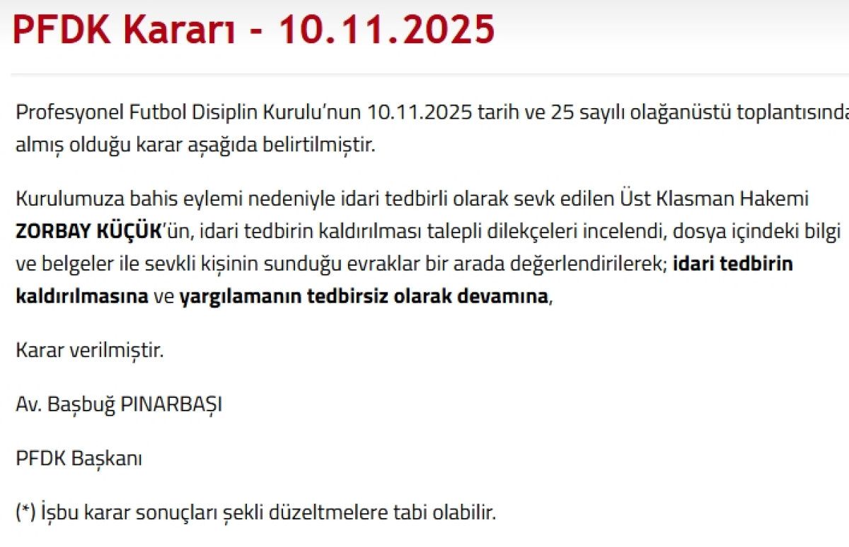 Kurulumuza bahis eylemi nedeniyle idari tedbirli olarak sevk edilen Üst Klasman Hakemi ZORBAY KÜÇÜK’ün, idari tedbirin kaldırılması talepli dilekçeleri incelendi, dosya içindeki bilgi ve belgeler ile sevkli kişinin sunduğu evraklar bir arada değerlendirilerek; idari tedbirin kaldırılmasına ve yargılamanın tedbirsiz olarak devamına, Karar verilmiştir.