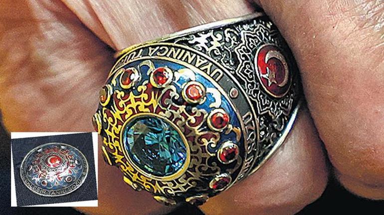 Bahçeli’nin özel tarasım yüzük ve rozeti yine dikkat çekti. Blue topaz ve yakut zirkon taşlarıyla bezenmiş, üzerinde Niyazi Yıldırım Gençosmanoğlu’nun “Meydan” şiirinden “Uyanınca Türk’ün özü, gerçekleşir Tanrı sözü” mısrası yazılı yüzüğün yan yüzeylerinde Selçuklu dönemine özgü geometrik bezemeler içinde ay-yıldız motiflerinin yer aldığı görüldü.