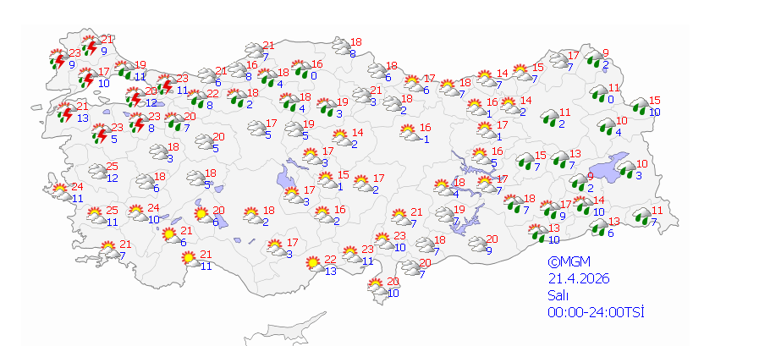 Yurt genelinin parçalı ve çok bulutlu, Doğu Akdeniz’in kuzey ve doğusu, Doğu Karadeniz, Doğu ve Güneydoğu Anadolu ile Ordu çevrelerinin aralıklı yağmur ve sağanak; Doğu Akdeniz ile Güneydoğu Anadolu sağanak ve gök gürültülü sağanak yağışlı, Doğu Karadeniz’in iç kesimlerinin yüksekleri ile Doğu Anadolu’nun kuzeydoğusunun yüksek kesimlerinin karla karışık yağmur ve kar yağışlı geçeceği tahmin ediliyor.