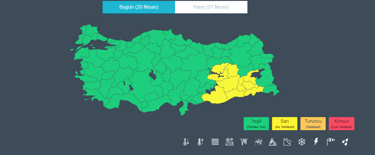 Meteoroloji Genel Müdürlüğü Bingöl, Bitlis, Diyarbakır, Elazığ, Mardin, Siirt, Tunceli. Şanlıurfa, Batman ve Şırnak için “sarı” kodlu uyarıda bulunuldu.