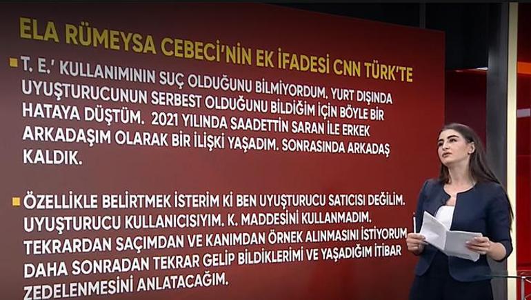 ” T.E.’ kullanımının suç olduğunu bilmiyordum. Yurt dışında uyuşturucunun serbest olduğunu bildiğim için böyle bir hataya düştüm. 2021 yılında Saadettin Saran ile erkek arkadaşım olarak bir ilişki yaşadım. Sonrasında arkadaş kaldık.