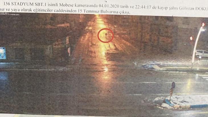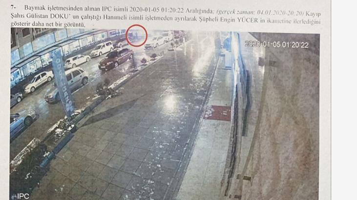 Baymak işletmesinden alınan IPC isimli kamerada; 05.01.2020 saat 20.22 sıralarında kayıp şahıs Gülistan Doku’nun Engin Yücer’in ikametinden ayrılarak sokak istikametine hareket ettiği.